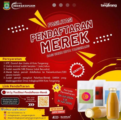 Dinas Perindustrian Perdagangan Koperasi dan Usaha Kecil Menengah (Disperindagkop UKM) membuka Fasilitasi Pendaftaran Merek Gratis bagi UMKM Kota Tangerang.